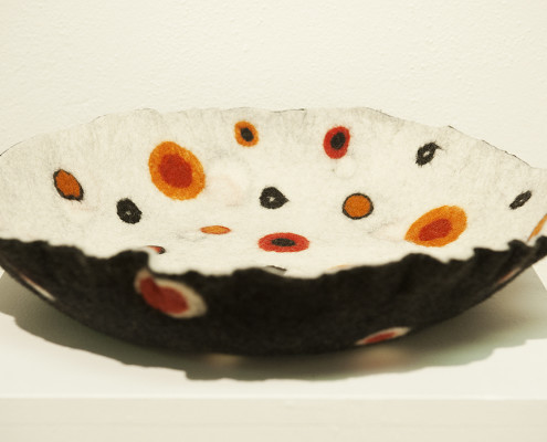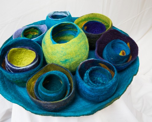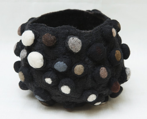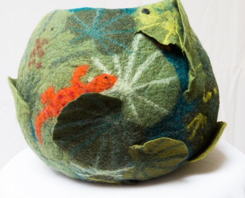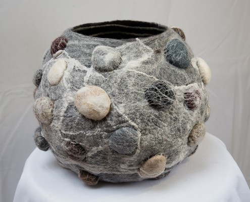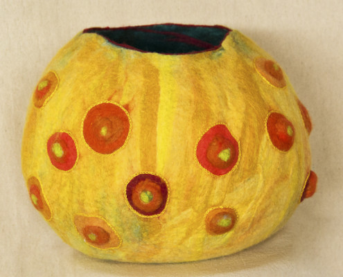 Vessels are an ancient form designed for function as a holder of objects. I approach the vessel as a holder of possibilities. Each one is unique and a story unto itself. My vessels start with a theme; sometimes just a simple color story or perhaps something more complex, such as pond life. The exterior and the interior each have their own story to tell. The vessel is formed by layering wet wool around an object (usually an inflated ball) and building up the vessel from the inside out. When all of the layers have been added, I cover the wool and start felting it with warm water, soap and my hands. The felting process itself takes around 4 hours. It is then rinsed and reformed and allowed to dry. Embellishment is added after the felting process is completed.